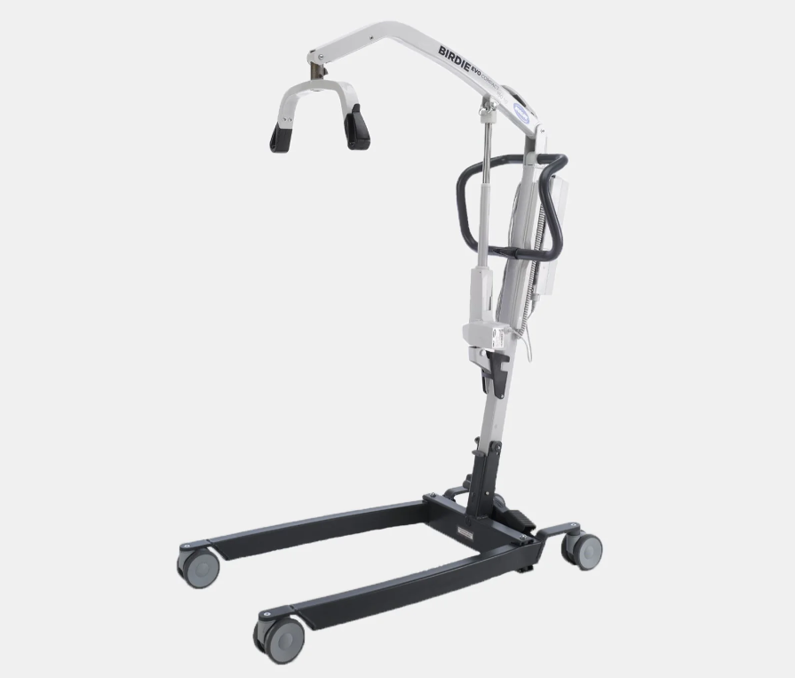 A lifting hoist is on castors to enable easy movement and is rated to a load of 150kg. Lifting is battery powered and controlled by a remote control and the legs are low profile so that they can pass under a bed or chair.